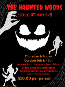 Come between 7-9 PM each night at Althouse Arboretum (1794 Gilbertsville Road, Pottstown PA). It is $10 per person. There will be our haunted woods, food, marshmallow roast and a scary movie to watch when you come out of the woods! Our haunted woods will have many scares with our student leadership team coming up with their very own horror scenes that will be sure to make you scream. It will be a night full of fun and horror, so come if you dare!